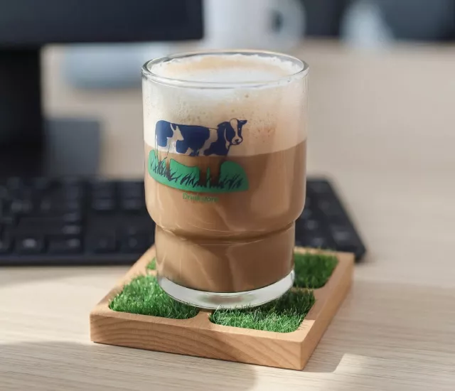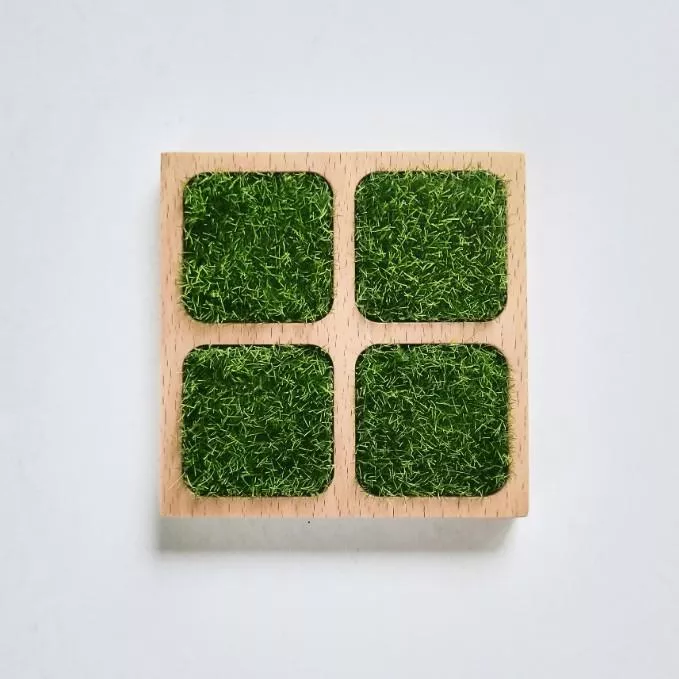 特殊植絨草皮設計,杯緣滑落的水滴會集中於四格「稻田」中,完美吸附不易弄濕桌面。喝再冰的飲料都不怕!